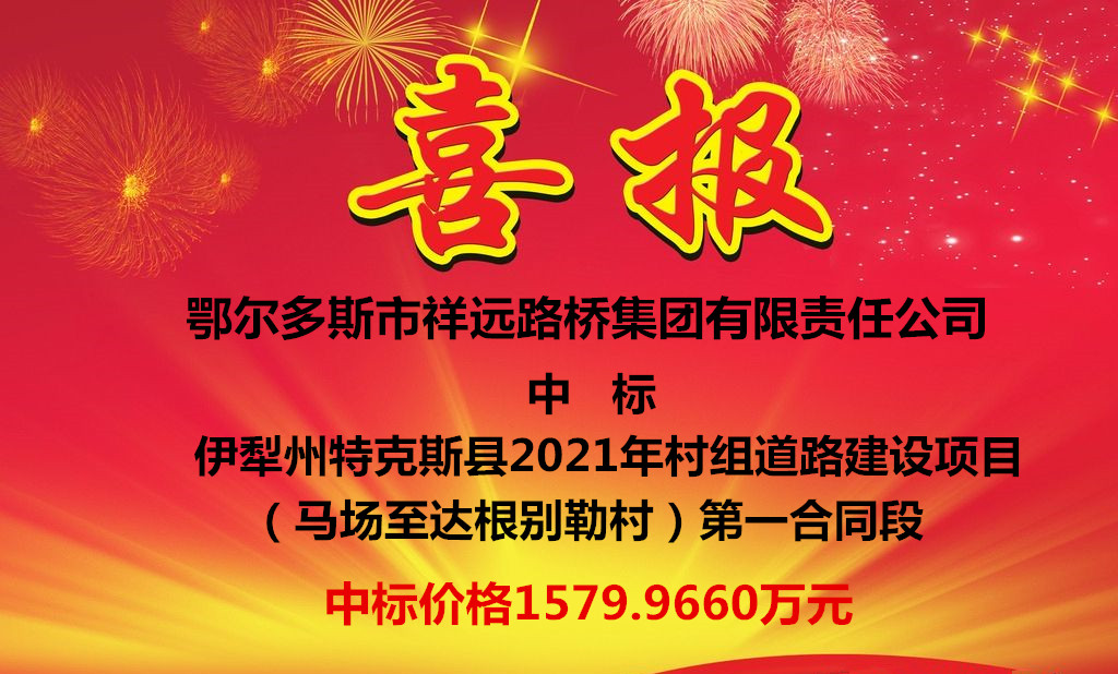 鄂爾多斯市祥遠路橋集團有限責(zé)任公司中標(biāo)伊犁州特克斯縣2021年村組道路建設(shè)項目(馬場至達根別勒村)第一合同段,道路總長19.565Km,中標(biāo)價格為1579.9660萬元.